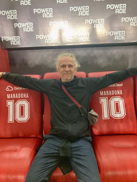 An einem meiner letzten Abende ging es dann noch einmal nach Paternal, dort wo meine Zeit in Buenos Aires mit Rene Ende Februar begonnen hatte. Wir waren damals ja im ehemaligen Wohnhaus und heutigen Maradonamuseum und das Stadion seines ersten Vereins, den Argentinios Juniors, befindet sich nur einen Steinwurf von seinem ehemaligen zu Hause entfernt. Ich hatte gelesen, dass es ab 18:00 Uhr noch Karten für Nichtmitglieder am Stadion geben soll und so war ich kurz vor 18:00 Uhr am Stadion. Zu meiner Überraschung wurden die interessierten Gäste von einem Vereinsverantwortlichen empfangen und es ergab sich ein Gespräch, in dem erfragt wurde, aus welchen Ländern wir kommen,dann wurde uns das Procedere des heutigen Abend erklärt. Wir bekamen Tickets und dazu ein Infoblatt über die besondere Bedeutung der Minute 10, ein Maradona Sticker und ein Armband als Eintritt in das Vereinsmuseum. Das mit dem Museum nahm ich erst einmal nicht so ernst, da das Spiel um 20:00 Uhr beginnen sollte und somit erst kurz vor 22:00 Uhr zu Ende sein wird. Ich hielt es für nicht sehr wahrscheinlich, dass um 22:00 Uhr noch ein Museum geöffnet hat. Nach Beendigung des Spiels gegen 22:00 Uhr ging ich dann doch noch am Stadionmuseum, welches sich unterhalb des Stahldaches befindet, vorbei und sah dann, dass das Museum tatsächlich geöffnet wurde und es für die Nichtmitglieder und heutigen Gäste des Vereins eine Museumsführung gab. Ein Museum, direkt unter dem Stadiondach, vollgestopft mit Exponaten aus einer über 100-jährigen Vereinsgeschichte. Und das um 22:00 Uhr, so etwas erlebt man nicht alle Tage. Gegen 22:45 Uhr wollte ich mich dann auf den Heimweg machen, schließlich hatte ich noch eine längere Fahrt bis nach Palermo vor mir. Mir wurde dann aber gesagt, dass ich jetzt noch nicht gehen könne, da für uns jetzt noch der Innenraum des Stadions geöffnet wird und wir den Rasen betreten dürfen und uns die Trainerbänke, die alle die Nummer 10 und den Schriftzug Maradona tragen, ansehen und Fotos etc. machen können.