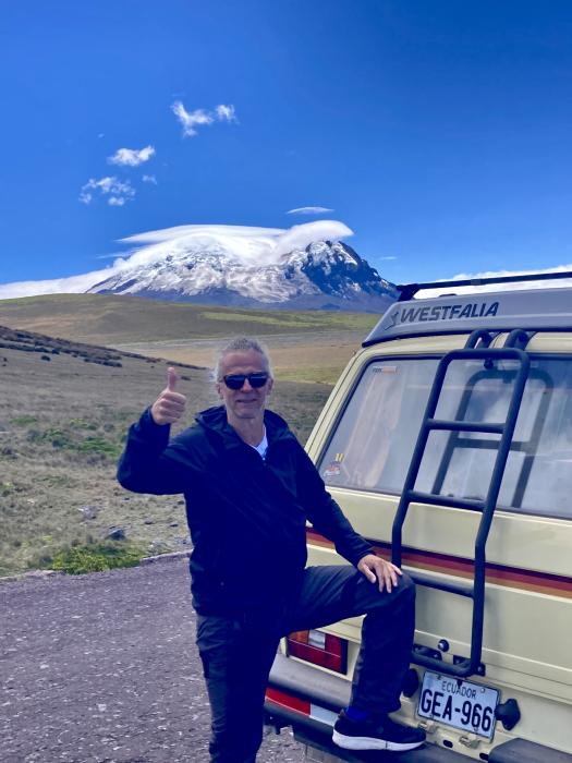 Am frühen Morgen zeigte sich keine Wolke und dies ist in den Anden um diese Jahreszeit sehr selten. Voller Hoffnung und Vorfreude machten wir uns um 8:30 Uhr auf den Weg. Die Fahrt in den Nationalpark dauert ungefähr 1,5 Stunden und kurz vor Ankunft zeigten sich am Horizont die ersten Wolken und erste Befürchtungen kamen auf, dass wir den Berg nicht zu Gesicht bekommen. Aber Ivan blieb zuversichtlich und sollte recht behalten. Man kann den Berg erst im letzten Augenblick erblicken, da er von noch anderen Bergketten verdeckt wird. Als wir dann um die entscheidende Kurve fuhren, zeigte sich der beeindruckende Antisana. Es ist ein ziemlich großes Glück, diesen mit 5785m Höhe viertgrößten Vulkanberg Ecuadors zu sehen. Das liegt daran, dass der Vulkan auf der östlichen Seite der Anden liegt und sehr nahe am Oriente( Dschungel) sich befindet. Die aus dem Oriente aufsteigende Luftfeuchtigkeit lässt den Berg an den meisten Tagen im Jahr in den Wolken verschwinden. Ich habe einmal gelesen, dass der Antisana an 35 Tagen im Jahr zu sehen ist. Ob das stimmt kann ich aber nicht genau sagen aber gefühlt ist das so. In meiner Zeit in Ecuador von 2010-2014 habe ich den Antisana nur einmal im Januar 2011 frei gesehen. Wir genossen diesen Anblick ausgiebig und unternahmen dann noch eine kleine Wanderung auf 4000 m Höhe im Nationalpark. Vor diesem Ausflug hatte ich mir gewünscht, den Antisana frei zu sehen und vielleicht noch einen Condor zu erblicken. Den Condor, das Wappentier Ecuadors, bekommt man nur in bestimmten Regionen des Landes zu Gesicht. Im Antisana Nationalpark solles aktuell circa 30 Condore geben. Im gesamten Land gibt es aktuell noch um die 100 Exemplare. Der Condor ist auf der roten Liste der vom Aussterben bedrohten Tiere und das Land unternimmt viel, um das Wappentier zu schützen. Der Condor kann eine Flügelspanne von bis zu 3,50 m erreichen und ist in der Lage, bis zu 30 Minuten in der Luft zu schweben ohne einen Flügelschlag zu tätigen. Normalerweise schwebt er in großen Höhen und ist aus der Nähe nur selten zu betrachten. Auf dem Heimweg entdeckte ich dann in unmittelbarer Nähe zu unserem T3 Bus einen Condor, der in nur ungefähr 10 m Höhe über uns kreiste. Schnell waren alle aus dem Bus und versuchten den Vogel mit der Kamera einzufangen. Corinna, die seit 2010 in Ecuador lebt, hatte bisher noch nie einen Condor in freier Wildbahn gesehen. Nachdem er einige Kreise über unseren Bus gezogen hatte, setzte er sich in circa 100 m Entfernung auf einen Felsen und ließ sich von uns betrachten. Der Ausflug in den Antisana Nationalpark hätte nicht schöner sein können.
