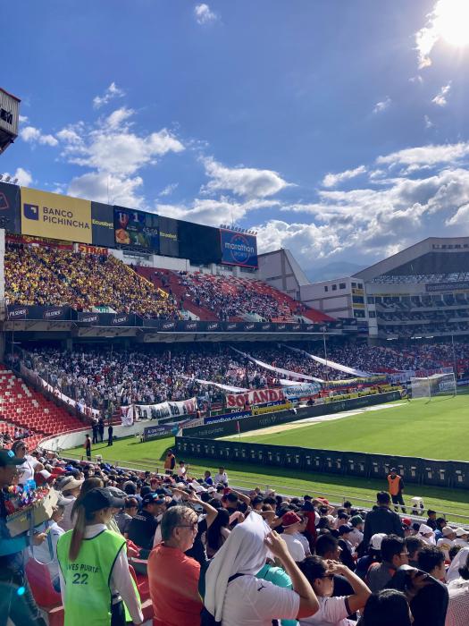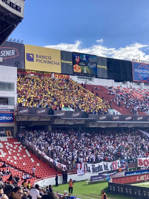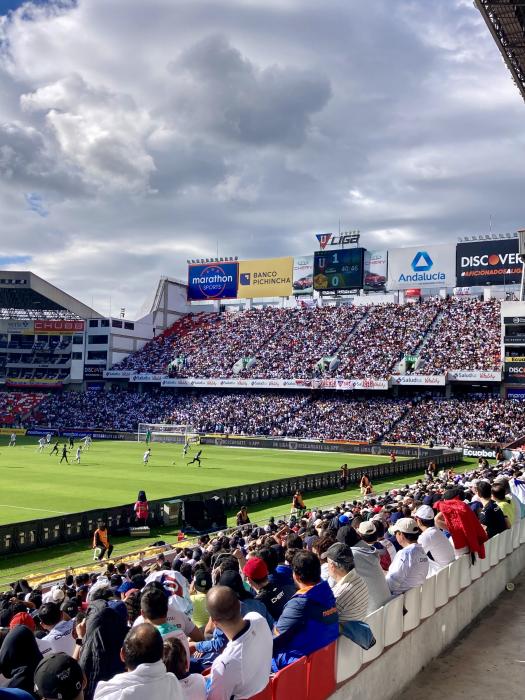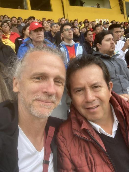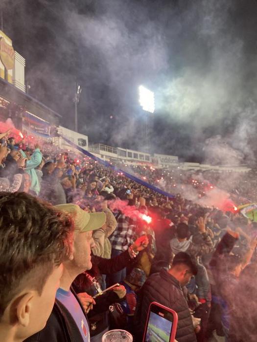 Zum Abschluss nochmal AtahualpaDas letzte Wochenende verbrachte ich im Hostal von Carola in Cumbaya. Am Samstagabend ging es ein letztes Mal ins Stadion und diesmal ins Atahualpa, dem alten ehrwürdigen Betonkessel mitten in der Hauptstadt. Es war ein besonderer Abend, denn Ivan ging mit seinem Sohn Yari zum ersten Mal gemeinsam zu Deportivo Quito, dem alten Traditionsverein der Hauptstadt. Der ehemalige vierfache ecuadorianische Meister spielt mittlerweile in der dritten Liga, was hier in Ecuador eine Provinz Meisterschaft ist. Der Verein hat aber immer noch mehr Fans, als die meisten Erstligisten. Zur heutigen Präsentation des neuen Trikots kamen an diesem Samstagabend circa 17.000 Zuschauer ins Stadion zur „Noche azulgrana“ Dabei muss man anmerken, dass es ausschließlich Fans von Deportivo und keine neutralen Zuschauer waren. Es war auch ein Wunsch von mir, einmal mit Ivan zu seinem Lieblingsverein zu gehen. Deportivo gewann dieses Spiel im Elfmeterschießen und ich sah um mich herum nur glückliche Menschen, die an eine bessere Zeit ihres Vereins glauben. Yari kaufte sich vor Spielbeginn ein Trikot von Deportivo und zog es an diesem Abend nicht mehr aus. Ich sah einen stolzen und glücklichen Vater und die Geburtsstunde eines neuen Deportivo Fans.