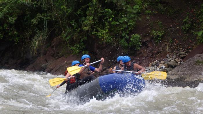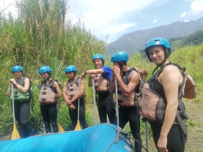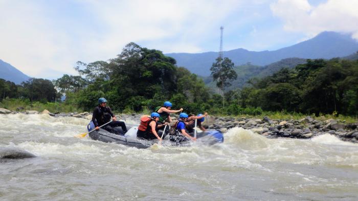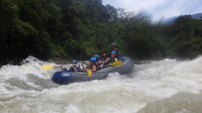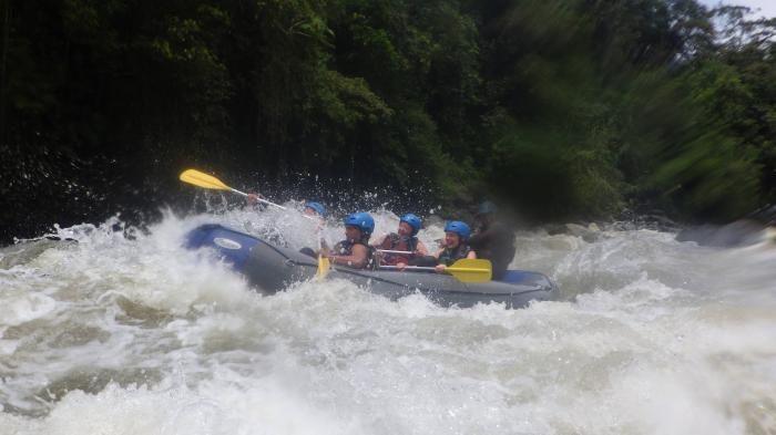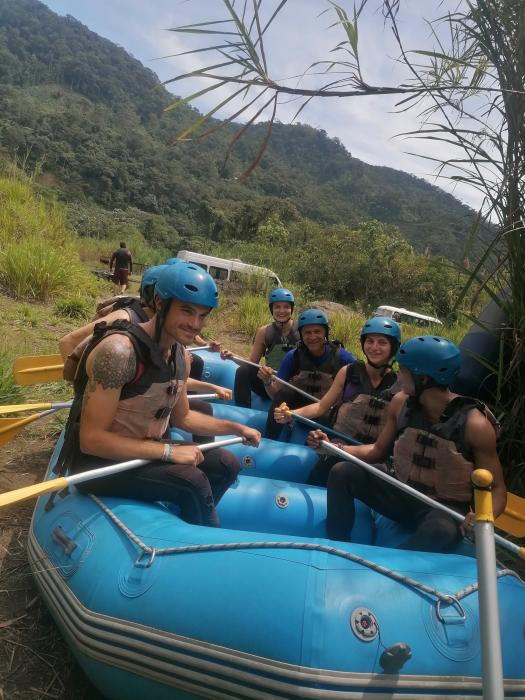 Am nächsten Morgen ging es um 9:00 Uhr von Banos aus los. Wir fuhren circa 30 Minuten Fluss abwärts Richtung Dschungel und gelangten dann an den Ausgangspunkt der Tour. Nach den üblichen Sicherheitsinstruktionen konnten wir starten. Wir waren acht Personen und zu meinem Erstaunen wurden wir auf zwei Boote aufgeteilt, da wir zu acht in einem Boot+!Guide wohl zu schwer wären. Die Kategorie der Tour wurde mit 3+ bis 4 angegeben. Es gibt insgesamt die Kategorien 1-6, wobei eins Schwimmungpool und sechs Wasserfall ist. Demzufolge sind für uns eigentlich nur die Kategorien 2-5 in Erwägung zu ziehen. Die Tour dauerte circa 1,5 Stunden und hatte eine Länge von rund 7 km. Im Gegensatz zu der Tour auf dem Rio Napo, wo es auch ruhige und entspannte Abschnitte gab, waren hier die Stromschnellen sehr dicht aneinander gereiht und es gab kaum Zeit, sich auszuruhen. So fehlt dann aber auch etwas die Zeit und die Muße, die atemberaubende und sich ständig verändernde Landschaft zu genießen. Einige Passagen waren sehr anspruchsvoll und so bin ich auch einmal unfreiwillig über Bord gegangen. Aber meine Mitfahrer haben mich sehr schnell wieder ins Boot gezogen. Insgesamt eine tolle Erfahrung, die sehr viel Spaß gebracht hat.