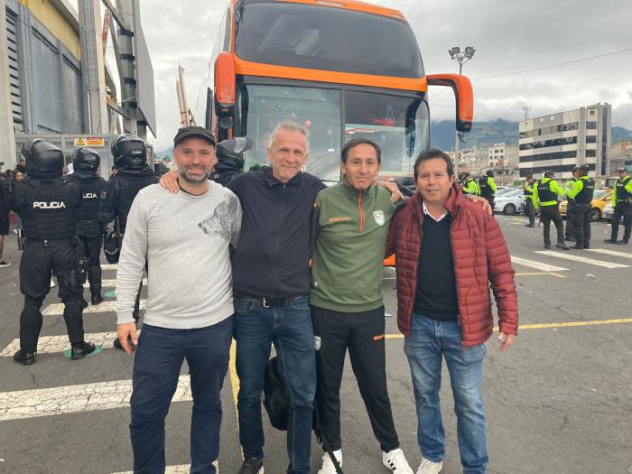 Nach dem Spiel entdeckte mein ExKollege Wilson, der mit der SUB 16 von Aukas in den achtziger Jahren Südamerikameister in Buenos Aires wurde und später für Aukas in der zweiten Liga spielte, im abfahrbereiten Bus der Gästemannschaft die ecuadorianischen Torwart Legende Pancho Reinoso. Da sich beide aus alten Zeiten gut kannten kam der ehemalige Nationaltorhüter und spätere Torwartrainer der ecuadorianischen National Nationalmannschaft zu uns aus dem Bus und wir unterhielten uns kurz mit Pancho, der mir erzählte, dass er auch einige Zeit in Deutschland verbracht hatte.