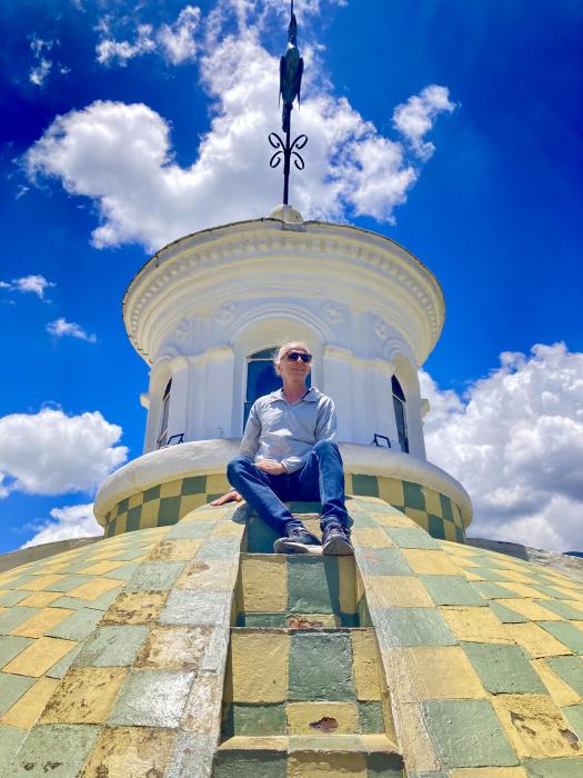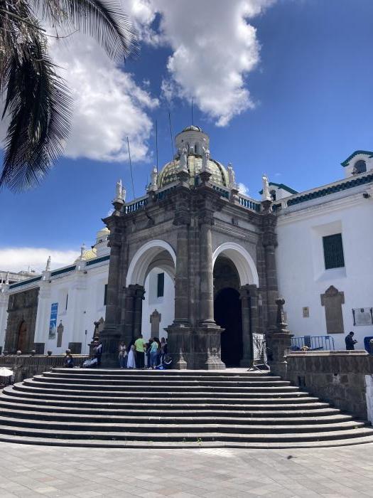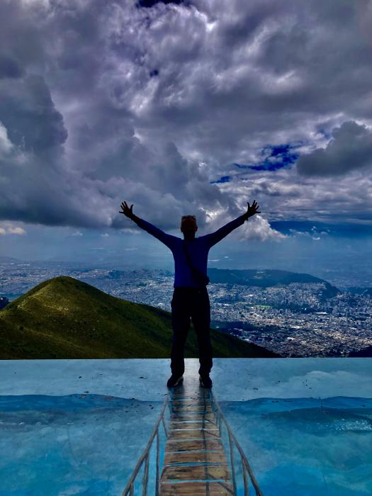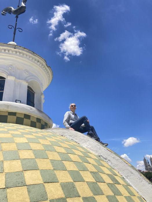 Über den Dächern der Altstadt und kein Schatten in SichtNachdem ich gestern schon etwas lockerer die morgendlichen 9 km laufen konnte, stoppte mich heute eine altbekannte Fußverletzung und ich beschloss eine Laufpause einzulegen. Ich nutzte den Tag und das schöne Wetter, um mir die Altstadt von Quito anzuschauen. Für die Anreise nutzte ich wieder den öffentlichen Bus und die U-Bahn. Die U-Bahn ist in vielen Städten der Welt ein ganz normales Fortbewegungsmittel aber hier wie bereits erwähnt eine Attraktion. Ich genoss die Ruhe und die schon fast bedächtige Atmosphäre in der Bahn. Es ist sehr leise in den Zügen und die Menschen sind sehr diszipliniert. Jeder Bahnsteig ist mit Polizisten gesichert und es gibt auf jedem Bahnsteig Personal, welches bei Zugeinfahrt ein Schild hebt und zur Vorsicht am Bahnsteig damit auffordert. Die Personalkosten sind hier anscheinend nicht so gravierend. Es gab die Nachfrage, wie sich eine Metro die 2 Milliarden $ gekostet hat mit Ticketpreisen von 0,45 € refinanzieren will? Dazu kann ich im Moment nicht allzu viel sagen. Ich weiß aber, dass die Weltbank und auch Europa wohl sehr zinsgünstige Darlehen vergeben haben. Sehr gelungen finde ich auch den Bahnhof mitten in der Altstadt am Plaza San Francisco. Der Bahnhof fällt überhaupt nicht auf und wurde in die bestehende Altbausubstanz integriert. Zuerst besuchte ich den Plaza Grande. Dieser sehr besonderer Ort, an dem sich die geistliche und weltliche Macht konzentriert. Der Platz wird vom Präsidentenpalast, Bischhofssitz, Kathedrale und Bürgermeister incl. Stadtverwaltung umrahmt. Der Präsidentenpalast ist nicht mehr frei zugänglich und mit einem Zaun abgesperrt. Es herrschte eine friedliche und ruhige Atmosphäre. Es war wenig Militär zu sehen, dafür patrouillierten viele städtische Polizisten. Einheimische und einige Touristen bestimmten das Stadtbild, ebenso wie die schon berühmten Schuhputzer von Quito. Kurz bevor ich zum Plaza San Francisco gehen wollte bemerkte ich auf dem Dach der Kathedrale einige Personen und ich beschloss, mir das ganze mal von Nahem anzuschauen. Es gibt in der Kathedrale ein Museum und dort wurde mir gesagt, dass es möglich ist auf die Kuppel der Kathedrale zu gehen. Ich müsste nur 30 Minuten warten. Nach einer Kaffeepause schloss ich mich dann einer Gruppe an, die in die Kathedrale geführt wurde. Wir wurden mehrmals gefragt, ob wir Platzangst hätten und bestiegen dann durch eine unscheinbare Tür in der Kathedrale eine sehr enge und dunkle Treppe, die mit einigen Hindernissen wie Eisenstreben und ähnlichem versehen war. Am Ende des Aufstiegs gelangte man durch eine kleine Öffnung auf das Dach und die Kuppel der Kathedrale. Ein traumhafter Rundumblick auf die Altstadt von Quito war die Belohnung. Zu meiner Überraschung erlaubte mir der Guide, noch die letzten Meter zur Kuppel hinauf zu gehen und erklärte sich auch noch bereit, ein Foto von mir zu machen.