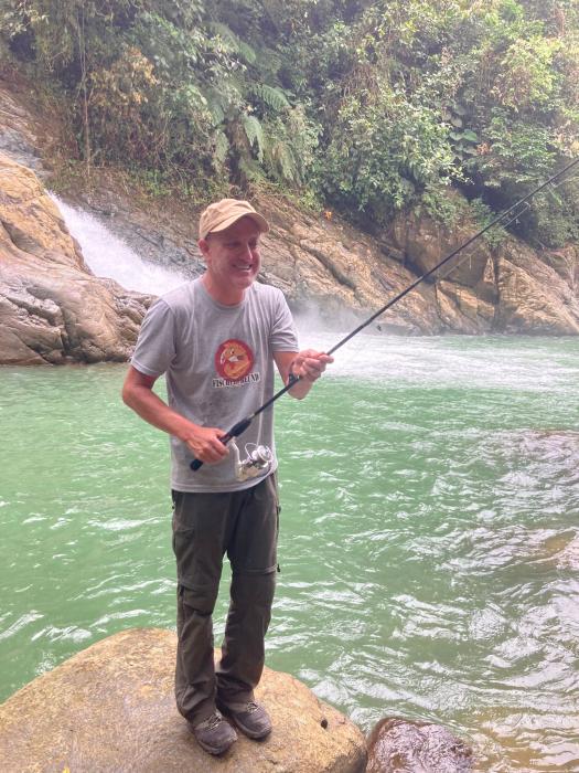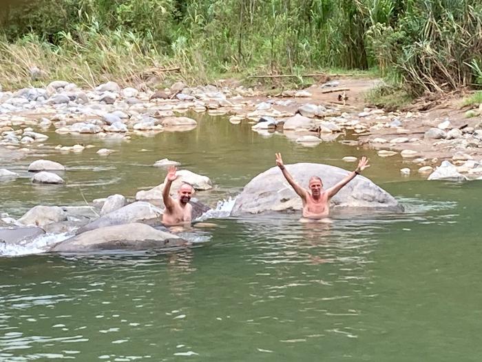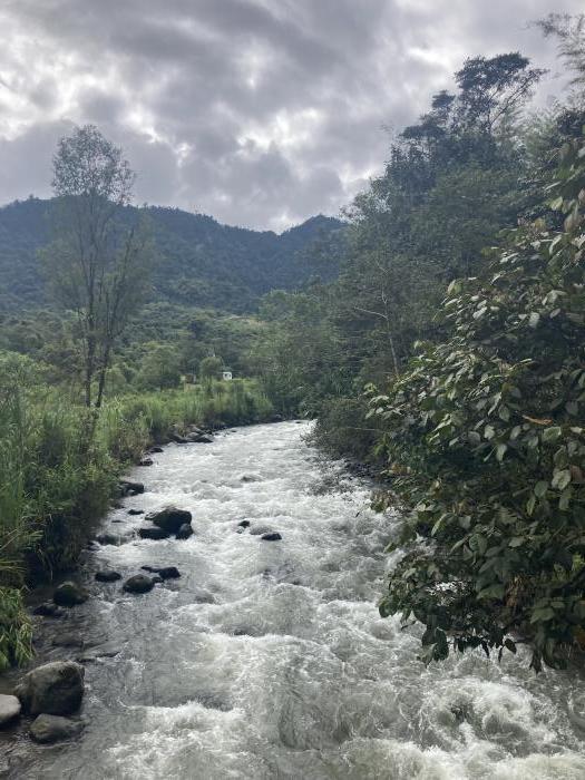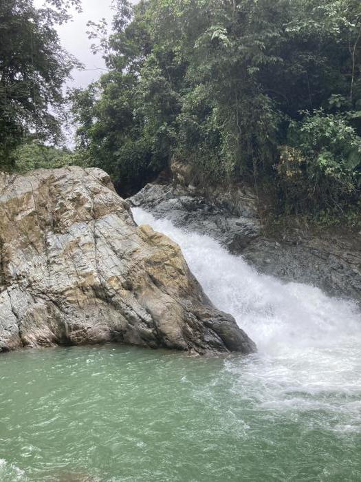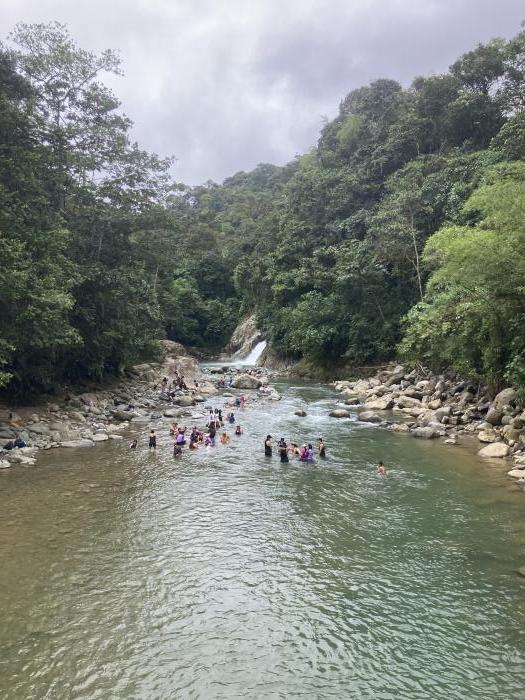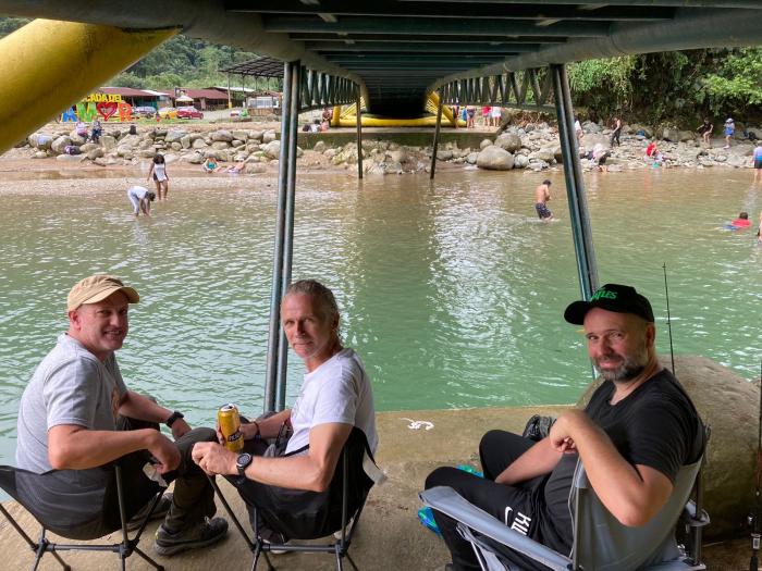 Am nächsten Morgen ging es dann mit dem Taxi zum circa 40 km entfernten Rio Blanco. An einer besonders schönen Stelle, der Cascada Amor (Wasserfall) suchten wir uns einen geeigneten Platz und direkt gegenüber dem Wasserfall gingen meine beiden Kollegen auf Forellenfang. Ich genoss das einzigartige Ambiente. Meine Kollegen fingen zwei Forellen, was eine 100-prozentige Steigerung zu den bisherigen Ausflügen der Fischerfreunde darstellt. Da die beiden Forellen aber noch nicht die entsprechende Größe hatten, wurden sie wieder zurück ins Wasser gelassen. In unmittelbarer Nähe gab es einige schöne Wasserbecken, die von der einheimischen Bevölkerung an diesem Samstag als Schwimm- und Badegelegenheit genutzt wurden. Wir entschlossen uns dann auch, das Angeln zu beenden und schlossen uns der einheimischen Bevölkerung an und genossen ein Bad im Rio Blanco. Dem obligatorisch einsetzenden Nieselregen am Nachmittag trotzten wir mit einem schönen Platz unter einer Brücke und sahen von dort dem bunten Treiben zu. Ohne Fisch aber zufrieden ging es dann am Nachmittag wieder nach Mindo zurück.
