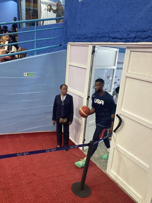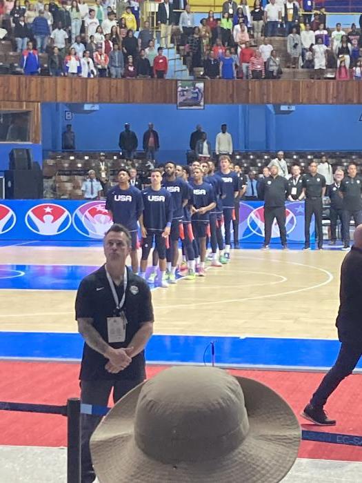 Aber nun zum Basketball. Vorweg, es war wieder ein ganz spezielles Erlebnis. Anreise und Einlass in die Halle verliefen unproblematisch und wir konnten schnell feststellen, dass es eine freie Sitzplatzwahl in der gesamten Halle gab. Die riesige und beeindruckende Halle war 30 Minuten vor Spielbeginn zumindest im Unterring einigermaßen gefüllt . Ich schätze es waren zu diesem Zeitpunkt ungefähr 2000 Zuschauer in der Halle. Dann kamen die Spieler aufs Parkett. Zuerst die Amerikaner und dann die kubanische Mannschaft. Die Frage, die uns zu diesem Zeitpunkt am meisten beschäftigte war, mit welchem Team die USA angereist ist. Wir vermuteten, dass es sich vielleicht um ein College Team handeln könnte. Wir hatten einen recht guten Platz auf Parketthöhe unterhalb einer Journalistenkabine. Wir konnten uns von den Journalisten ein Foto von den Mannschaftsaufstellungen machen. Daraus wurde ganz schnell klar, dass es sich nicht um eine reine College Mannschaft handeln konnte, da ein Großteil der Spieler schon Ende 20 oder Anfang 30 Jahre alt war.
